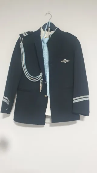 Traje de almirante para comunión, elegante y completo. - Chaqueta azul marino con detalles plateados. - Corbata a juego. - Hombreras y cordones decorativos. - Insignia en la solapa.