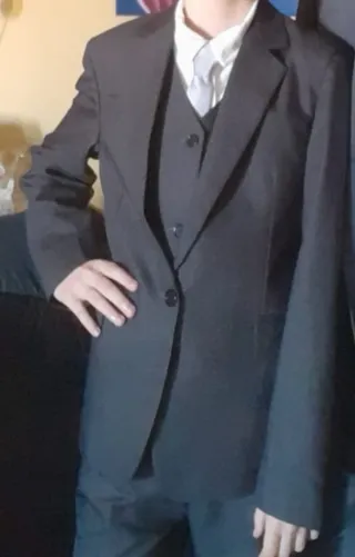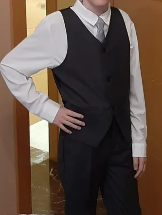 Traje con un solo uso: - Chaqueta de un botón. - Chaleco a juego. - Pantalón a juego con gomas para ajustar la cintura. - Camisa blanca. - Corbata gris.