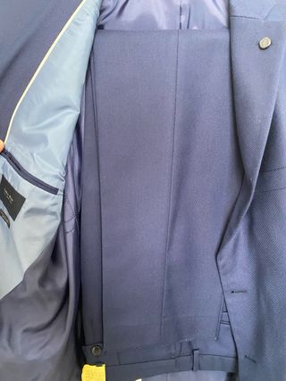 Traje de vestir color azul marino, en excelente estado. - Chaqueta con un botón. - Pantalón a juego. El traje incluye chaqueta, corbata y pantalón.. Está prácticamente nuevo..