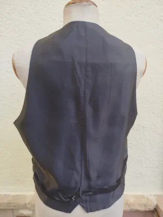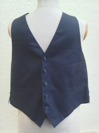 Chaleco hecho por sastre sin etiquetas. Como no indica talla doy medidas: de axila a axila 58 cm., largo desde el hombro parte corta 61 cm ., parte más larga 67 cm., contorno cintura 102 cm.