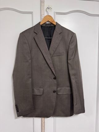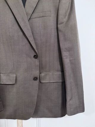 Chaqueta de traje elegante en color café, usada una sola vez. - Diseño de un solo botón. - Bolsillos frontales con solapa. - Forro interior negro. Viene junto al pantalón talla 46 EU. El material es excepcional y muy detallado, está prácticamente nuevo y se ajusta muy bien al cuerpo. Ideal para ceremonias como graduaciones, etc.