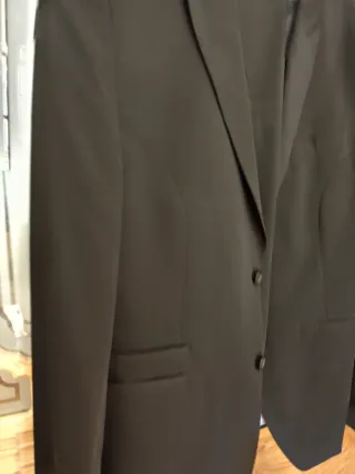 Elegante traje de hombre en color negro. Usado solo en graduación de bachiller. - Chaqueta con solapa de muesca. - Cierre de dos botones en la chaqueta. - Bolsillos frontales con solapa. - Puño de tres botones.