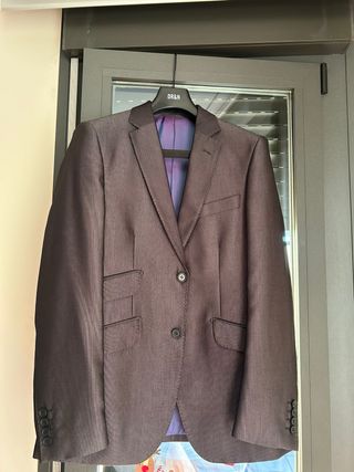 Elegante traje de hombre de la marca DR&N. Presenta un diseño clásico con un forro interior de color morado vibrante. - Chaqueta de dos botones. - Bolsillos frontales con solapa. - Puños con botones.
