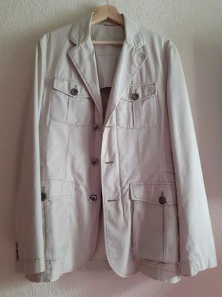 Americana Titto Bluni de diseño clasico. Doble cierre con cremallera interior y/o 3 botones exteriores. 4 bolsillos exteriores con solapa y botones. 3 bolsillos interiores, 2 con cremallera. Triple boton en puño. Trabilla en parte interior para colgar prenda. 100% algodon. Talla L. Medidas: axila a axila 56 cm. Moda hombre. Color arena / beige. Perfecto estado. 70 euros