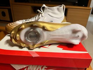Botas de fútbol americano con un diseño llamativo en blanco y dorado. TALLA 44.5 o 45 , dan talla son 11 USA Se venden por error al comprar