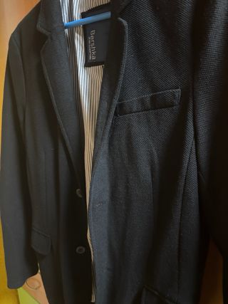 Americana de la marca Bershka en color negro. Presenta un diseño clásico y elegante, ideal para diversas ocasiones. - Cierre de botones. - Bolsillos frontales. - Forro interior a rayas.