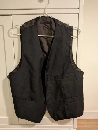 Chaleco elegante para hombre, ideal para ocasiones formales. Talla 48, corresponde a una M. Parte delantera negra, 100% lana. Parte trasera marrón oscuro, 100% viscosa. Marca Massimo Dutti. Usado poco. Precio negociable.