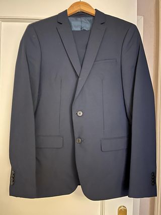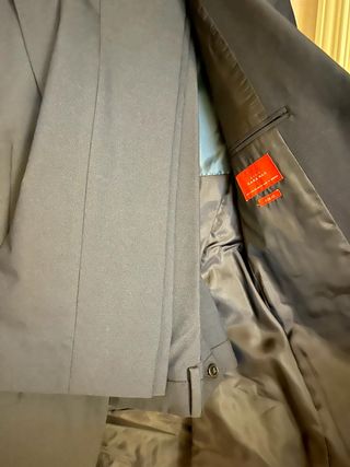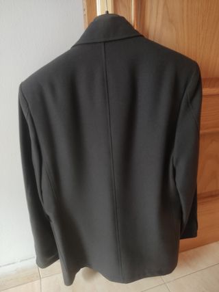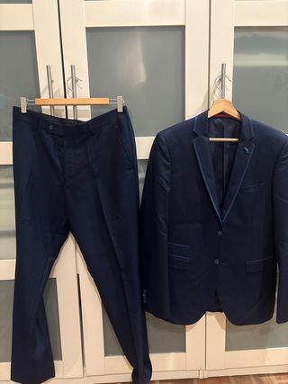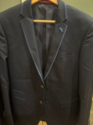 Traje de hombre, color azul. Talla 46 de Chaqueta y S de pantalón. Tiro del pantalón 74 cm. Alto de chaqueta 70 cm, ancho 43 cm.