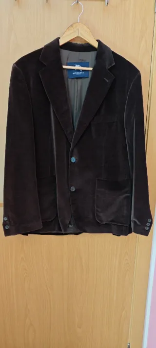 Elegante chaqueta marca Burberry para hombre, hecha en terciopelo color marrón. Presenta un corte estándar con solapas de pico, cierre de botonadura simple con 2 botones. Bolsillo de ojal en el pecho, 2 bolsillos laterales. Puños abotonados (le falta un botón en la manga derecha). Forro completo, construcción de media entretela. Abertura trasera en los dos laterales. Botones de cuerno de búfalo. Poquísimo uso, muy bien cuidada, prácticamente nueva. Talla 56.
