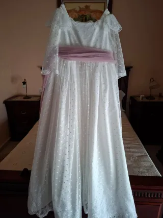 Traje de comunión hecho a medida por una diseñadora. Un diseño único y especial. - Vestido blanco con detalles de topos. - Lazada de tul rosa en la cintura. - Tul de seda. - Con complemento del pelo a juego.