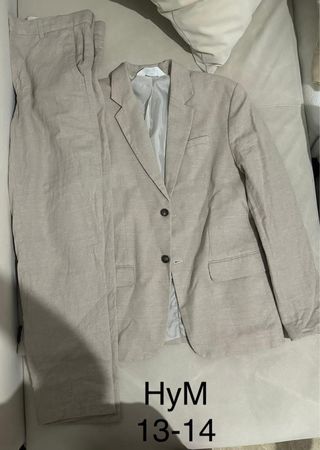 Traje gris cruzado (en la primera foto se ve azul pero es gris). Medidas: hombros 46cm. Largo chaqueta 82cm. Cintura pantalón 104cm y largo 108cm