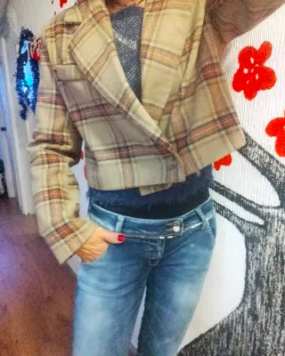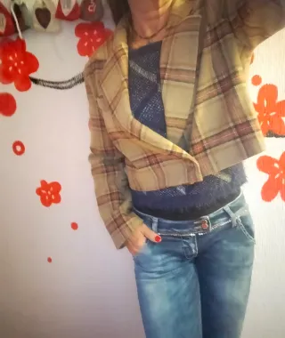 Americana corta con un diseño de cuadros clásico. - Corte moderno y favorecedor. - Cierre cruzado con botón. - Bolsillo de solapa en el pecho.