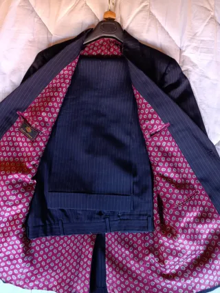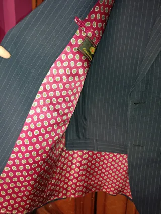 Traje de alta confección juvenil usado unicamente 2 veces. Compuesto por pantalón, camisa, corbata y americana. El pantalón, aunque es ajustado, es muy cómodo y adaptable a los movimientos. La corbata es de 100% seda y esta hecha a mano. La americana tiene doble forro. Tallas: Pantalón: 50 (Al ser un traje de corte juvenil esta talla no corresponde con una talla de hombre) Camisa: M Americana: No pone talla pero se puede asemejar a una talla 48-50 normal. (La marca de Sinigual del anuncio se corresponde con la marca de la camisa)