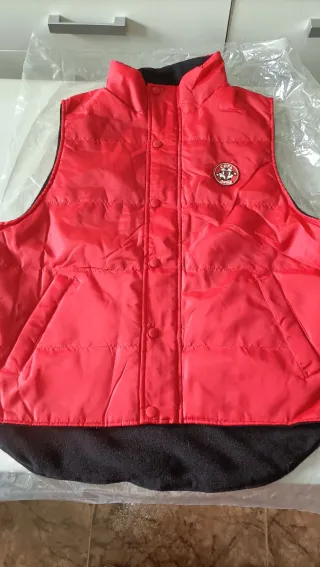 Chaleco acolchado de la copa Coca-Cola con detalles en negro. Nuevo, a estrenar. - Cierre de botones a presión. - Bolsillos laterales. - Cuello alto. - Cremallera.