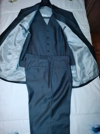 Traje de chaqueta y pantalón para hombre. - Color gris. - Diseño con raya diplomática. Antes de mandarlo tendria que pasar por tintorería lleva mucho tiempo cerrado usado una vez Costo 100€