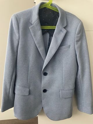 Chaqueta de vestir de color azul claro, ideal para ocasiones especiales. - Diseño clásico con solapa. - Cierre de dos botones. - Dos bolsillos frontales. Un solo uso en la Primera Comunion.