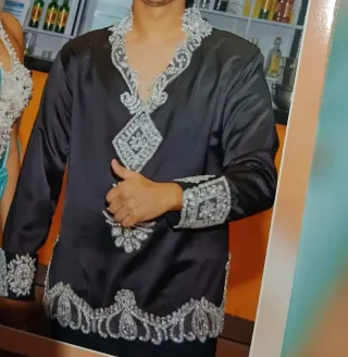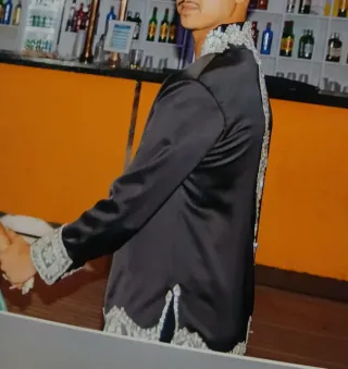 Traje de gitano para novio, con un diseño elegante y llamativo. - Chaqueta negra con bordados plateados. - Cuello y puños adornados. - Diseño con detalles de pedrería. Viene pantalón camisa y zapatos