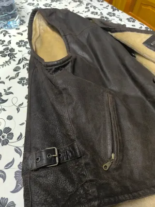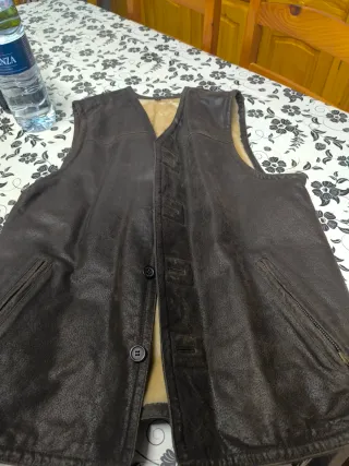 Chaleco de cuero marrón con forro interior. - Cierre de botones. - Bolsillos laterales con cremallera. - Diseño sin mangas. Ideal para montar a caballo o para cazar o andar por el campo está sin estrenar