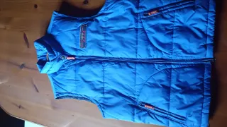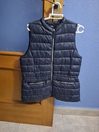 Chaleco acolchado de color azul, perfecto para añadir una capa extra de abrigo. - Cierre de cremallera frontal. - Dos bolsillos con cremallera en la parte delantera.