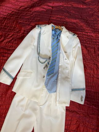 Conjunto de traje de comunión completo. Incluye chaqueta y pantalón. Talla 12 - Chaqueta blanca con detalles en hombros y puños. - Pantalón blanco. - Corbata a rayas azules y amarillas. - Adorno de cordón plateado en el pecho. - Insignia plateada en la solapa. Usado solo una vez , el dia de la comunión.