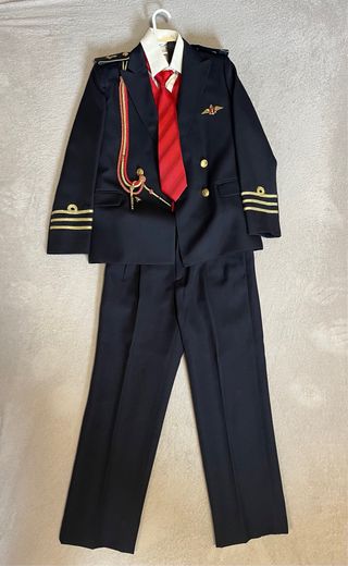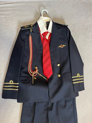 Conjunto de traje de piloto para niño, ideal para disfraces o eventos especiales. Incluye chaqueta y pantalón. Talla 10 - Chaqueta azul marino con detalles dorados. - Corbata roja a rayas. - Insignias de aviador en la solapa y puños. Usado solo una vez en la comunión.