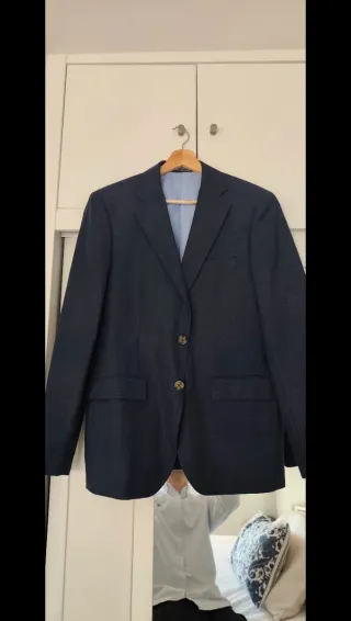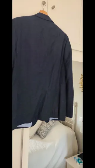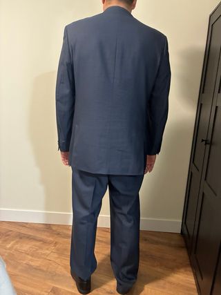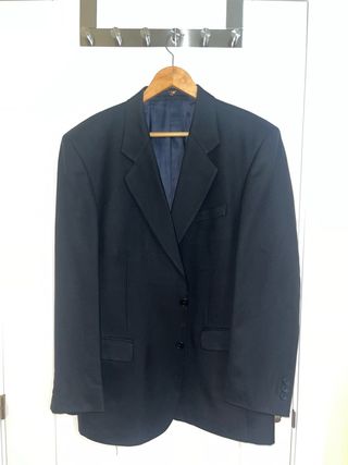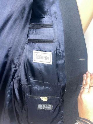 Traje de chaqueta azul. 100% lana Modelo mide 1,78 y pesa 84kg Tiene que pasar por el tinte ya que presenta alguna manchilla