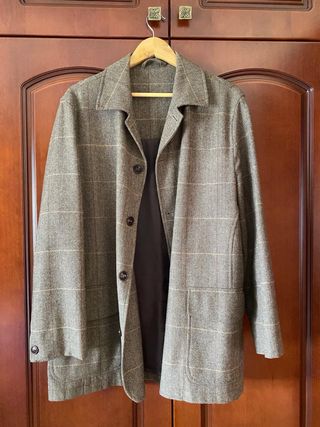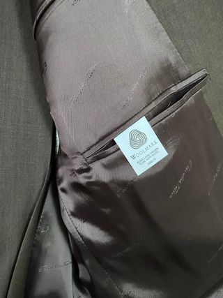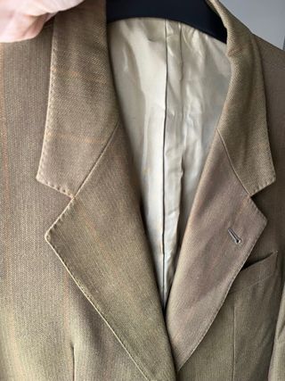Chaqueta de hombre de lana 100% de la marca italiana Lanficio di Pray de la sastrería Britto's de Sevilla. Un clásico para cualquier armario. ¡Y está nueva! - Tejido de lana 100% de alta calidad. - Forro 100% Viscosa. - Tiene hombreras. - Color verde oliva y marrón. - Diseño elegante y atemporal. Tiene 2 bolsillos exteriores cerrados (pero se pueden abrir) y 3 bolsillos interiores. Abotonada en el frontal + 2 botones de repuesto.