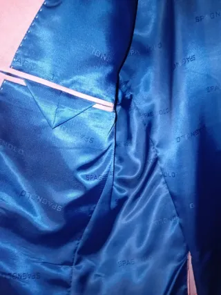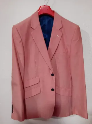 Chaqueta de la marca Spagnolo en color rosa. Talla 50. - Diseño de solapa clásica. - Cierre de dos botones. - Bolsillos frontales con solapa. - Forro interior azul.