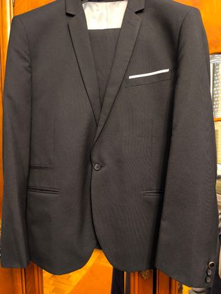 Traje de chaqueta y pantalón para chico, con un corte entallado. - Chaqueta con solapa de muesca. - Cierre de dos botones en la chaqueta. - Bolsillos frontales con solapa. - Forro interior azul. Américana talla 44 y pantalón 46, solo usado un rato en la graduación