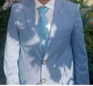 Traje de dos piezas en color azul. Traje azul usado en eventos religiosos exclusivamente. Como nuevo, usado por un chico de 15 años complexión delgada. Queda entallado. Tiene en el hombro un pequeño descosido como aparece en las fotos