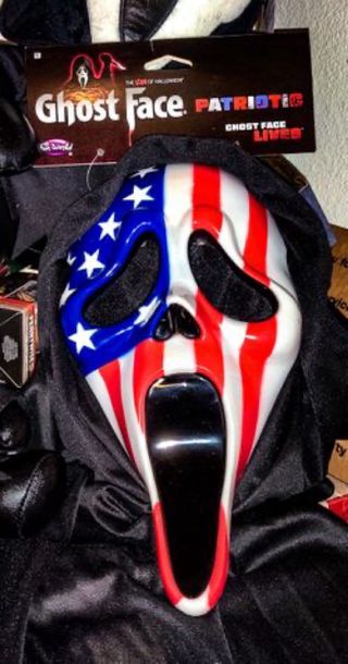 EDICIÓN ESPECIAL. Máscara de Halloween estilo Ghostface con diseño patriótico americano. Perfecta para fiestas temáticas o disfraces. - Diseño de bandera de Estados Unidos. - Incluye capucha negra. - Talla única.