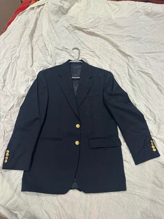 Americana clásica de color azul con detalles dorados. - Dos botones frontales. - Tres botones en cada manga. - Bolsillos frontales con solapa.