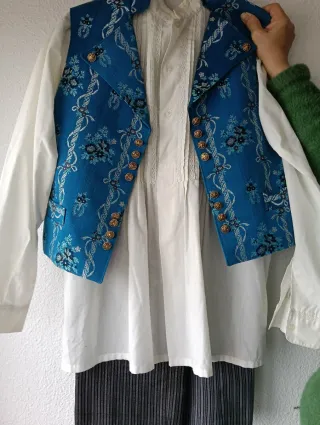 Traje completo de fallero con diseño elaborado SOLO EL CHALECO: 30€ - Chaleco azul con estampado floral y detalles plateados. Talla 18 - Botones dorados en el chaleco. - Camisa blanca con cuello alto y detalles de puntilla. Talla 35 - Pantalón a rayas. Talla 38/40
