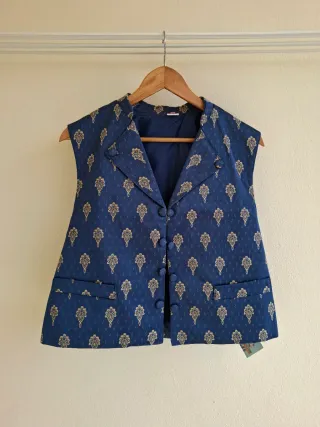 Chaleco fallero abierto nuevo, sin estrenar, con un bonito estampado. - Diseño con solapas. - Botones decorativos forrados. - Bolsillos delanteros. Es de La casa de los falleros.