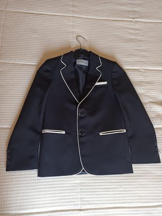 Chaqueta americana de niño, ideal para celebraciones y eventos especiales. - Diseño elegante con ribetes blancos. - Cierre de dos botones. - Bolsillo de ojal en el pecho. - Puños con tres botones.
