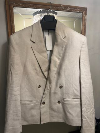 Elegante blazer de Zara con un diseño clásico de doble botonadura. Perfecto para añadir un toque sofisticado a cualquier atuendo. - Tejido de lino o mezcla similar. - Dos bolsillos frontales con solapa. - Cierre de dos botones en la parte delantera.