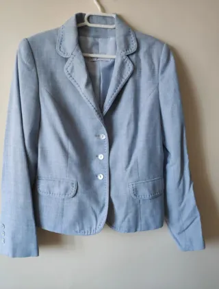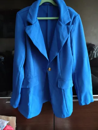 Americana de color azul, con un diseño moderno y elegante. Talla M 38. - Solapas clásicas. - Cierre de un botón. - Bolsillos frontales con solapa.