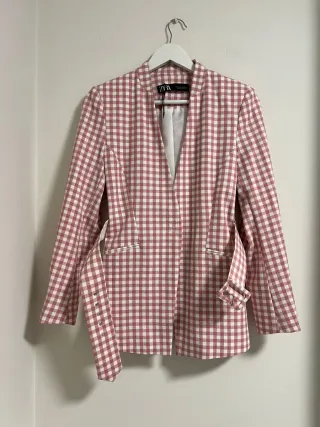 Americana de Zara con un diseño de cuadros. - Cuello mao. - Cinturón. - Puños con botones.