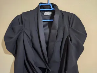 Vendo americana o blazer de color negro. Talla XXL de mujer. Posee cuello en forma de pico, dos bolsillos delanteros, y los botones de abrir y cerrar la chaqueta y los de las mangas de la americana son iguales, y tienen forma de flor. Posee signos de desgaste, pero se encuentra en buen estado. Muy cómoda y elegante. Es un básico ideal para cualquier look. Las medidas son: - De sisa a sisa: 63cm - De largo: 79cm - El largo de la manga: 55cm Un básico de ropa de fiesta o para eventos elegantes. Estilo vintage.