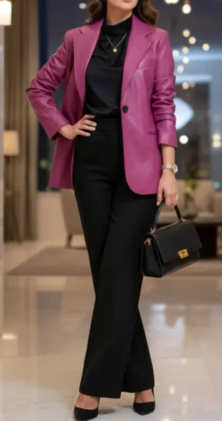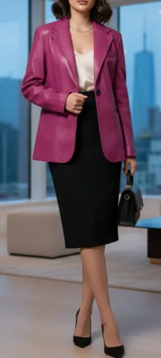 americana de cuello solapa y manga larga confeccionada en tejido de efecto piel con un acabado muy suave. Destaca por su vibrante color fucsia/magenta, ideal para dar un toque de color y elegancia a cualquier conjunto. Detalles del diseño: Cierre frontal con un único botón central en color negro a contraste. Bolsillos delanteros de vivo muy discretos. Detalle de botones decorativos en los puños. Abertura trasera en el bajo para mayor comodidad y movimiento. Interior forrado al tono para un mejor acabado.