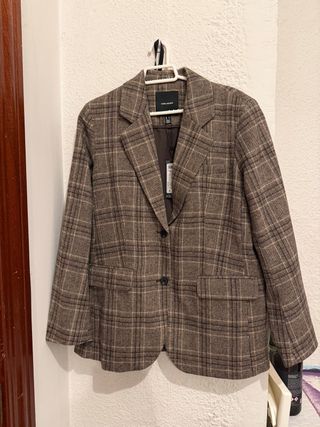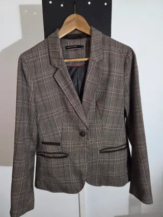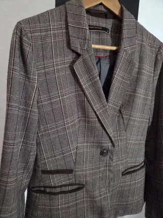 Americana de cuadros con un diseño elegante. - Patrón de cuadros clásico. - Detalle en los bolsillos. - Cierre de un botón. Apenas usada. Puede valer también para M