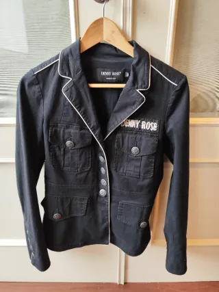 Americana de la marca Denny Rose en color negro. Presenta un diseño elegante y moderno. - Cierre de botones. - Bolsillos frontales con solapa. - Detalle de ribete blanco en cuello y solapas. - Puños con botones.