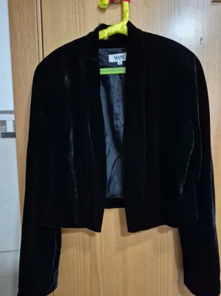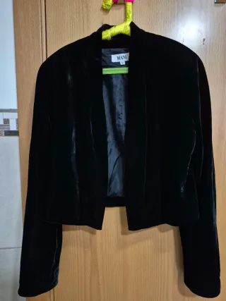 En muy buen estado. Elegante americana de terciopelo negro. - Corte moderno. - Diseño abierto.Es corto