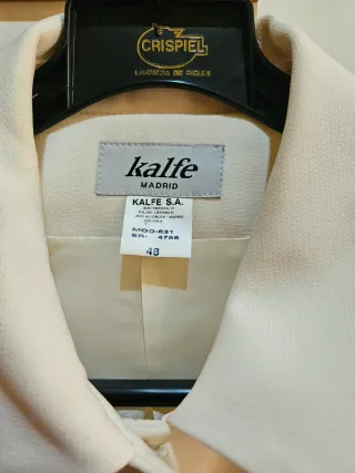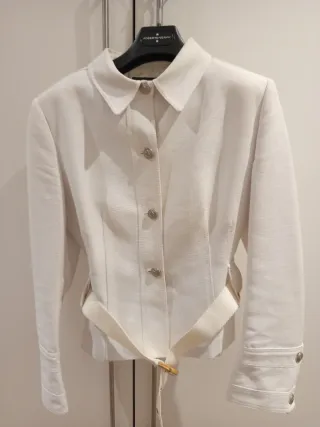 Elegante americana de color blanco, perfecta para ocasiones formales o para añadir un toque sofisticado a tu atuendo. - Diseño con detalles en el cuello y bajo. - Cierre de botones. - Corte entallado. Falda a conjunto incluida Tiene una mancha en la manga por eso el precio barato