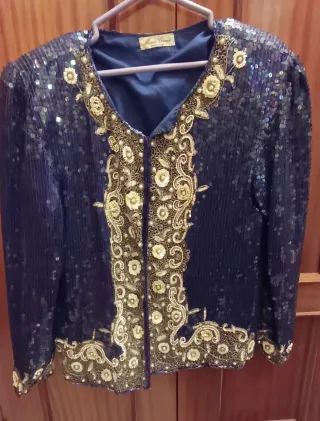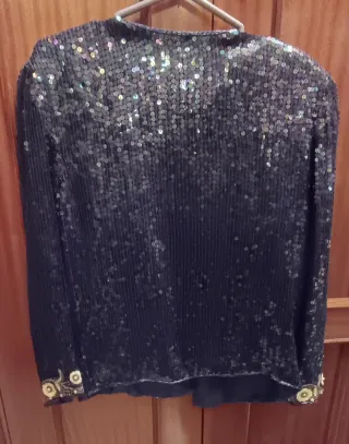 Elegante americana con un diseño llamativo de lentejuelas. - Cubierta completa de lentejuelas. - Detalles dorados en el delantero, los puños y el bajo. Puede cerrarse toda con checks. Ancho entre hombros: 40 cm Largo: 60 cm Largo manga: 56 cm