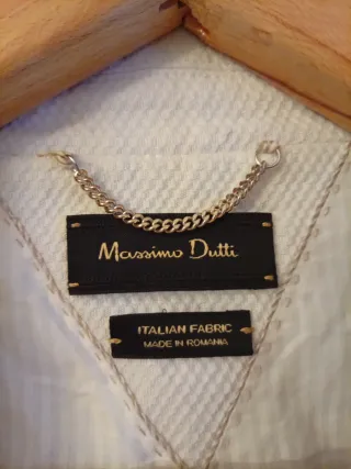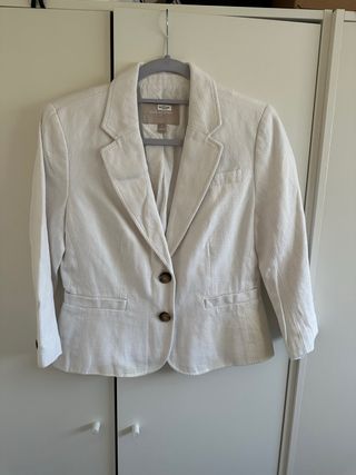 Americana de Massimo Dutti para mujer en color blanco. Un clásico versátil para cualquier ocasión. - Cierre de un botón. - Bolsillos delanteros. - Diseño de solapa. - Tejido de lino. - está usada pero está bien.