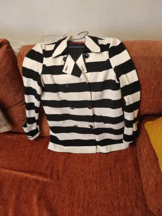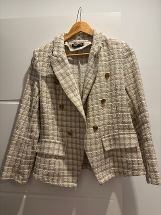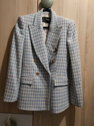 Americana de doble botonadura de Zara. - Diseño clásico. - Botones dorados. - Bolsillos frontales. Artículo solidario