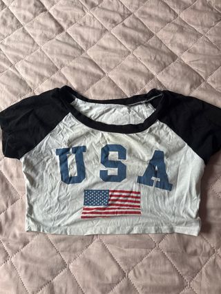 Top corto con diseño de USA y la bandera americana. Las mangas son de color negro y el cuerpo blanco. - Diseño USA en letras azules. - Bandera americana estampada. - Mangas cortas tipo raglán.