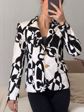 Americana con un llamativo estampado abstracto en blanco y negro. estiro vaquera Yo uso XS y me queda como en las fotos. Medidas: Largura de manga 58cm De hombro a hombro:39cm Largo: 55cm Algodón 100% Marca: Onara OnJeans Americana vintage Está en perfecto estado, cualquier duda escríbeme - Diseño de corte clásico. - Cierre de un botón. - Dos bolsillos frontales con solapa