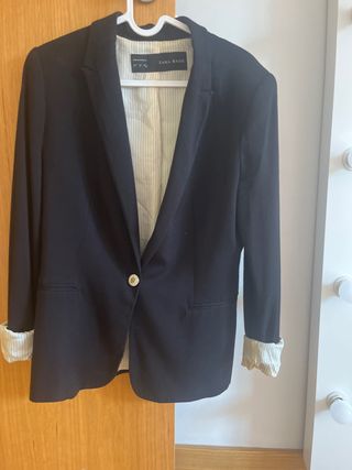 Blazer de la marca Zara. Puesta queda ESPECTACULAR de Bonita, Entallada. Talla M. Está Nueva IMPECABLE, nada de uso. - Diseño moderno. - Forro interior en tono azul claro. - Detalle de cintas satinadas en solapas y puños. - Cierre de un botón. - Puños con botones decorativos. ESPECTACULAR de Bonita. Costó 90€